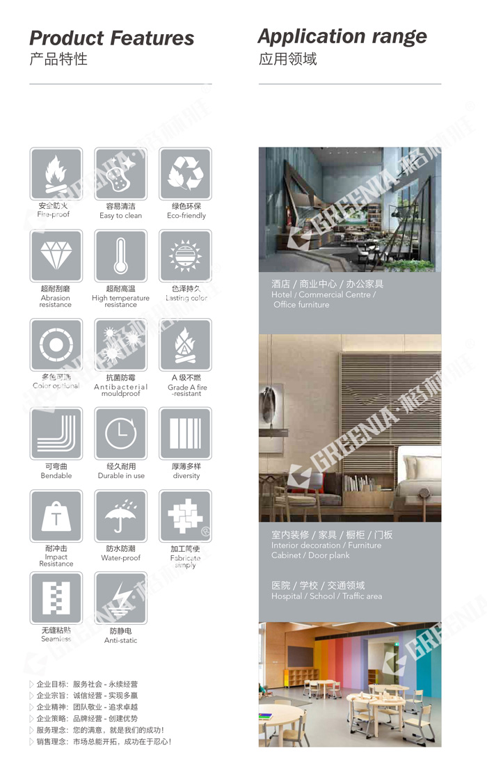 1)綠色環保 2)價格合理 3)防水和煙灼性 4)耐磨耐刮 5)易於清潔 6)抗菌的特性