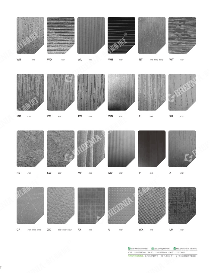 香蕉在线播放耐火板可定製不同厚度(0.6-1.5mm)與不同的表麵處理和不同的尺寸。可用的表麵處理和相應的尺寸如下: